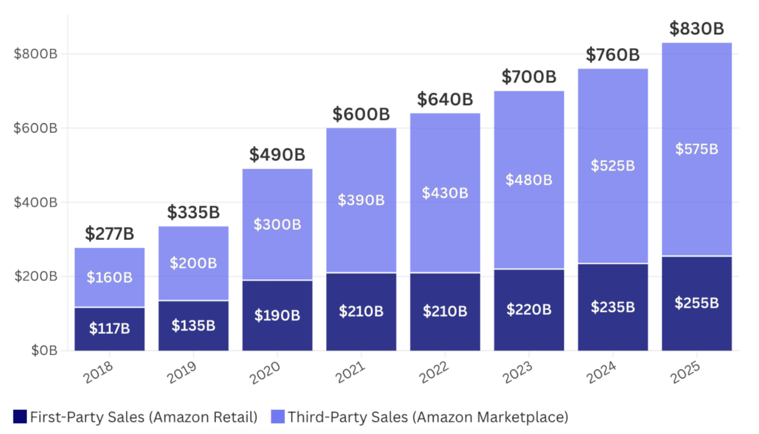 Seller transactions carry higher payment processing costs as a percentage of net sales because processing is based on the gross purchase price of underlying transactions. The operational scale is enormous: over one million warehouse robots, a regionalized fulfillment network, and more than 8 billion same-day or next-day items delivered in 2025. FBA fees increased approximately $0.08 per unit for 2026 to cover rising fuel and logistics costs.