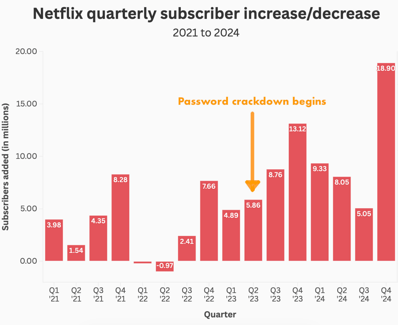 The password-sharing crackdown has been a major driver of subscription growth. When Netflix began prompting members to pay extra for sharing accounts outside one household in 2023, the results were immediate. In the United States alone, daily sign-ups increased by 102% following the announcement. This initiative contributed to a record 19 million net additions in Q4 2024, the largest quarter of growth in the company's history.
